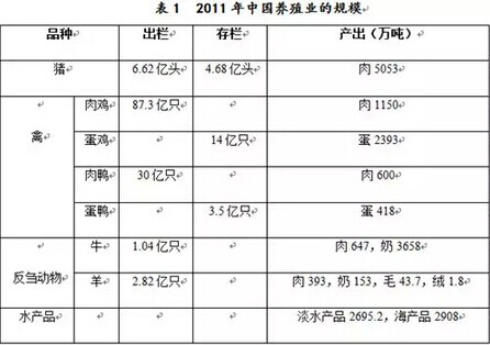 中國(guó)是世界上最大的食品動(dòng)物養(yǎng)殖國(guó),養(yǎng)殖規(guī)模大,養(yǎng)殖密度高,環(huán)境污染嚴(yán)重。據(jù)國(guó)家統(tǒng)計(jì)局,2011年中國(guó)肉類(lèi)總產(chǎn)量7958萬(wàn)噸、奶3810萬(wàn)噸、禽蛋2811萬(wàn)噸、毛類(lèi)45.5萬(wàn)噸、淡水產(chǎn)品2695.2萬(wàn)噸,具體如表1所示。