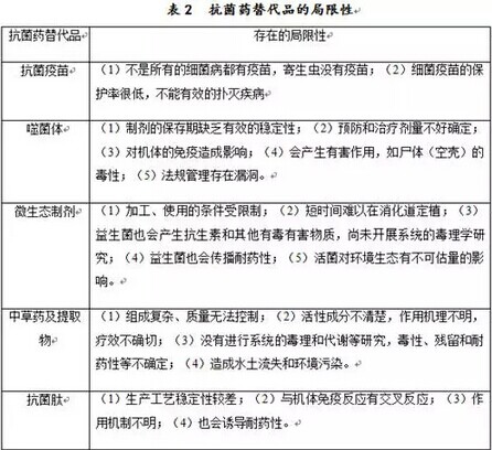 針對(duì)獸用抗菌藥在使用上出現(xiàn)的一些問(wèn)題,目前出現(xiàn)了一些抗菌藥的替代品,如抗菌疫苗、噬菌體、微生態(tài)制劑、中草藥及其提取物、群體感應(yīng)及生物被膜抑制劑、抗菌肽、酶制劑,雖然這些替代品在使用過(guò)程中發(fā)揮了一定的作用,但是由于存在著不同的局限性而影響限制了使用,所以這些替代品是不能完全替代抗菌藥的,具體如表2所示。